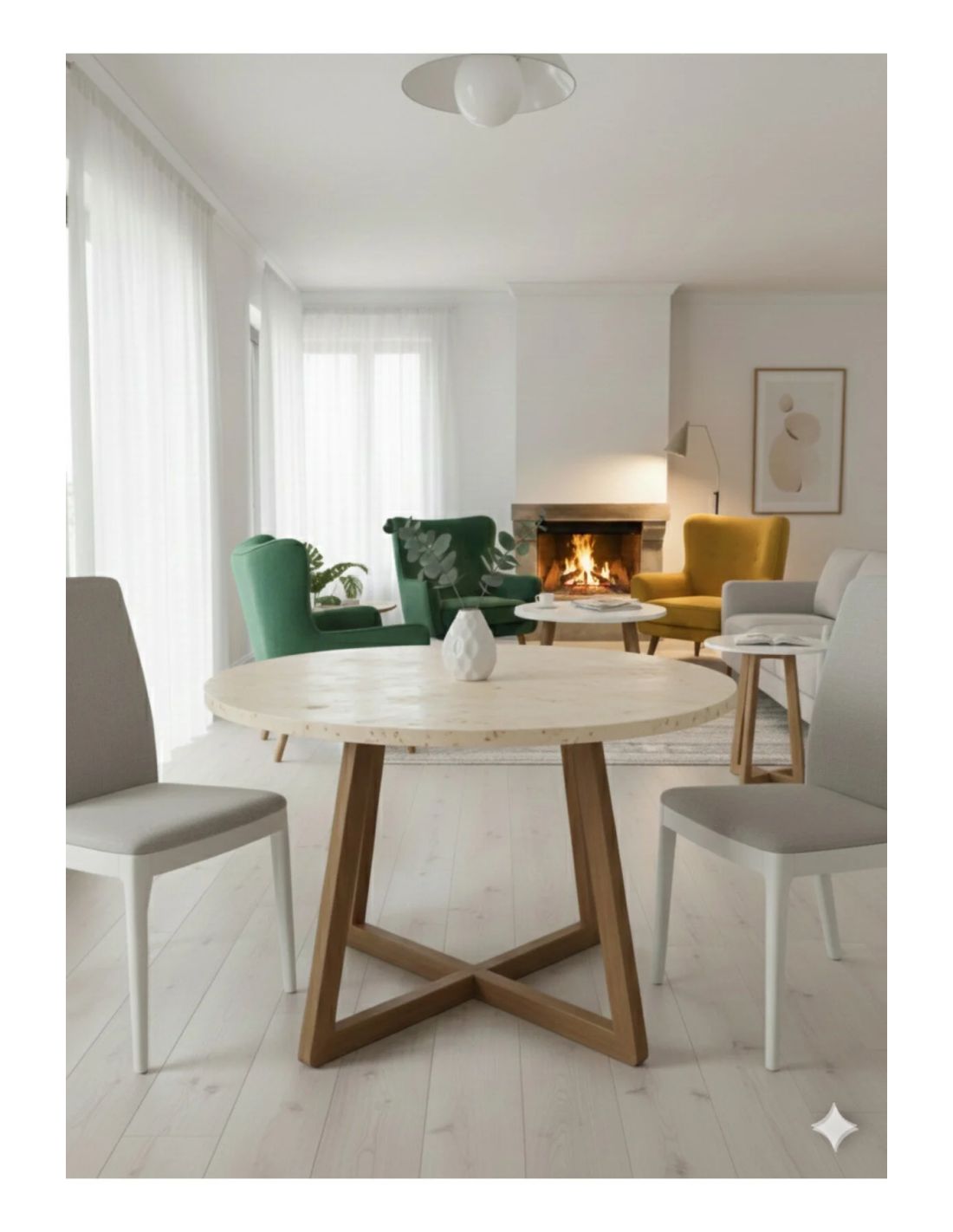 Modern Beyaz Orta Sehpa + Yan Sehpa + Masa Takımı | Gürgen Ayaklı, MDF / Traverten Üst Tabla