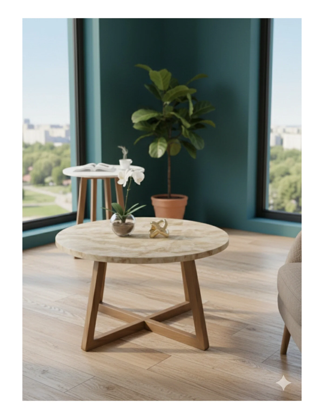Modern Masa + Orta Sehpa 2’li Set | Gürgen Ayaklı, Traverten MDF Tabla